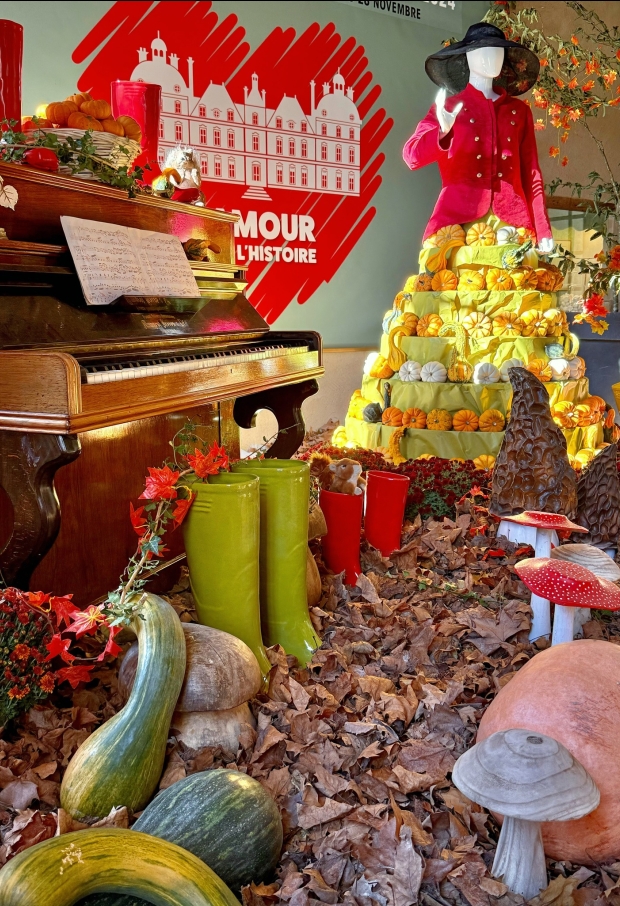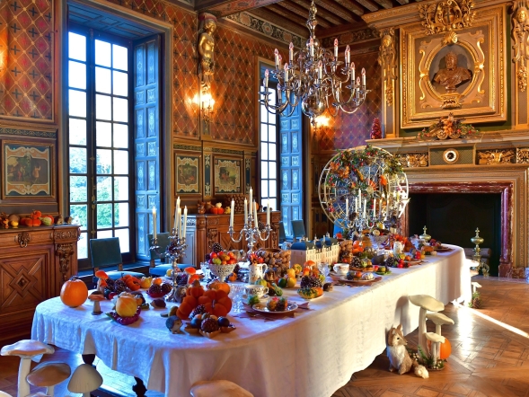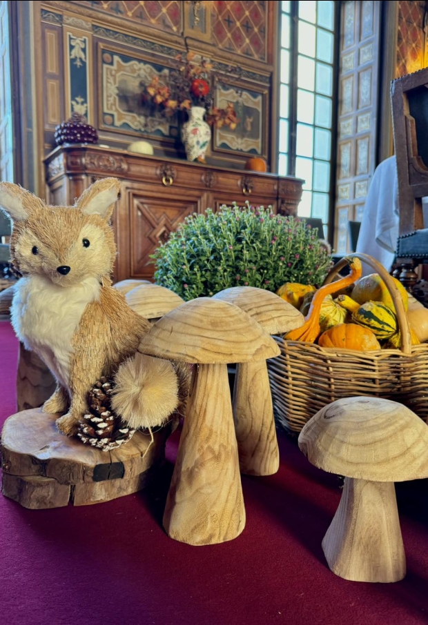À l’intérieur, la chaleur des boiseries et des tapisseries se marie parfaitement à l’esprit automnal. La grande salle à manger accueille la table d'automne avec des animaux des sous-bois, des champignons et des feuilles mordorées.