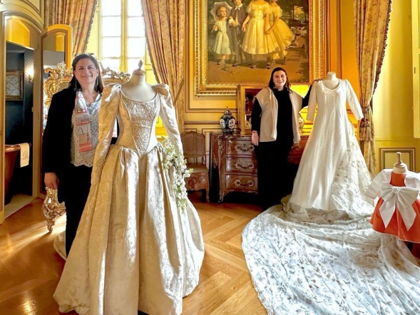 La chambre des mariés présente deux robes de mariées de la famille :