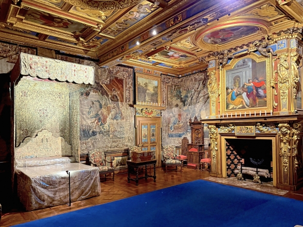 Considérée comme la pièce la plus richement décorée du château, la chambre du roi accueille au premier étage :