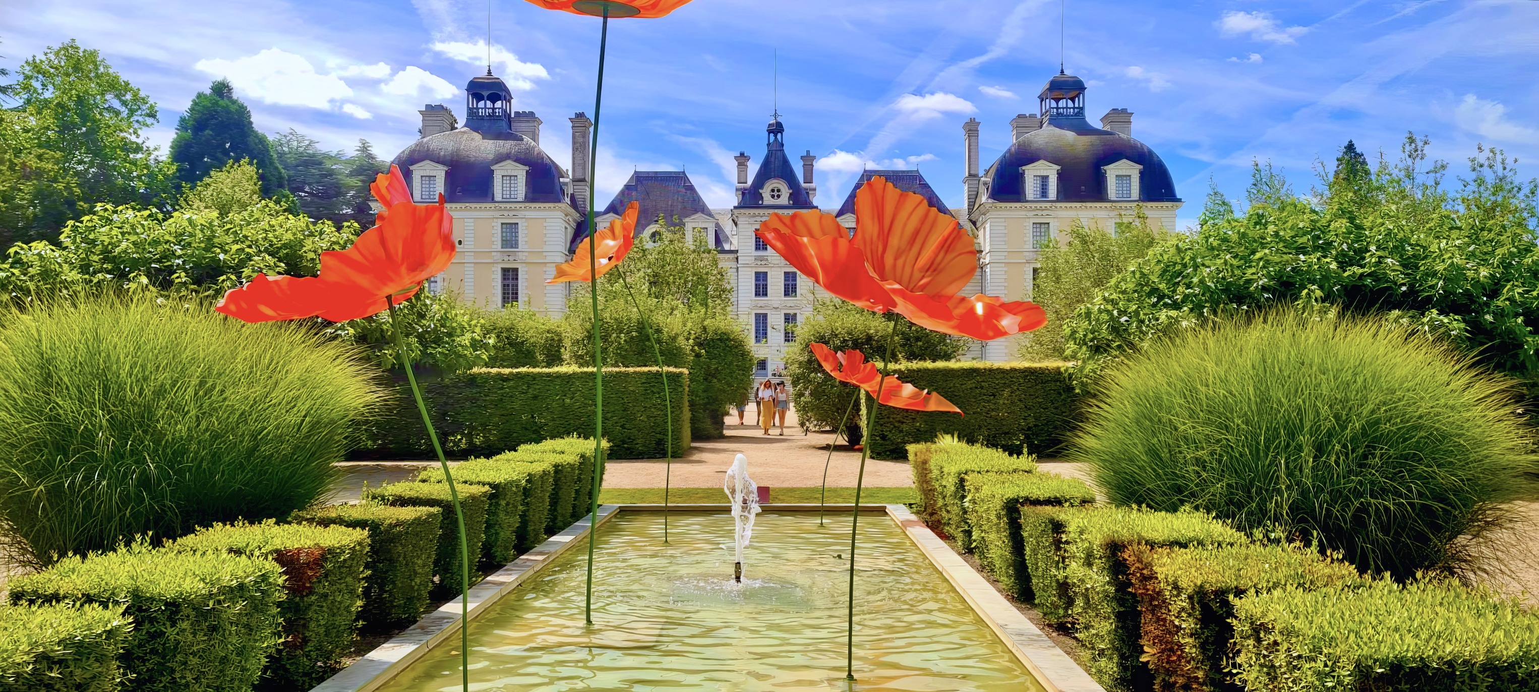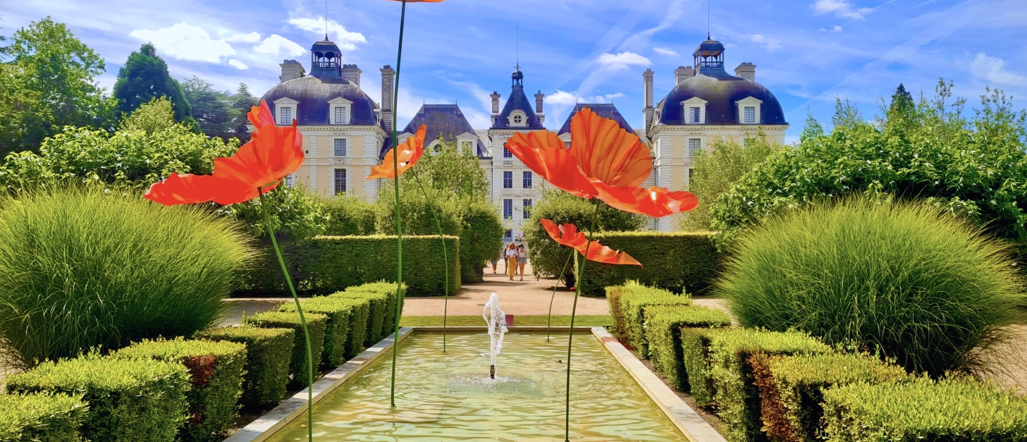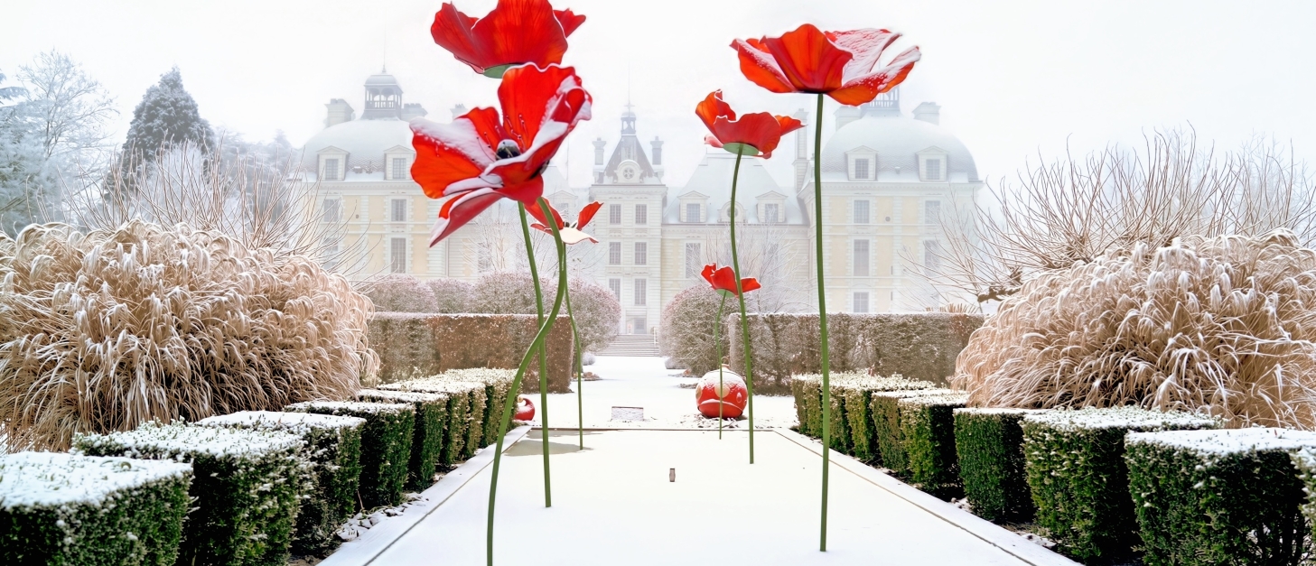 Depuis juillet 2024, de monumentales sculptures en forme de coquelicots enchantent le jardin des apprentis et vous entrainent dans un univers coloré, entre le château et l'Orangerie.