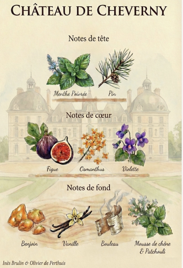 Le parcours présente également sept autres parfums originaux, chacun conçu pour dialoguer avec une pièce du château : atmosphères boisées, notes d’archives, évocations de feu de cheminée, de promenades forestières, de lumière d’été ou de soirées d’hiver.