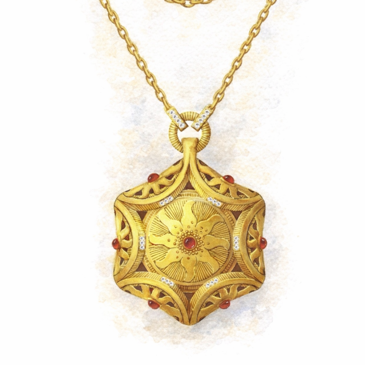 Réalisée en vermeil et sertie de 26 diamants et 7 rubis, cette création contemporaine s’inspire directement des poignées de porte de la salle d’armes, dont elle reprend la silhouette pour en faire un véritable astre miniature : le volume rayonnant évoque le cœur du soleil et les