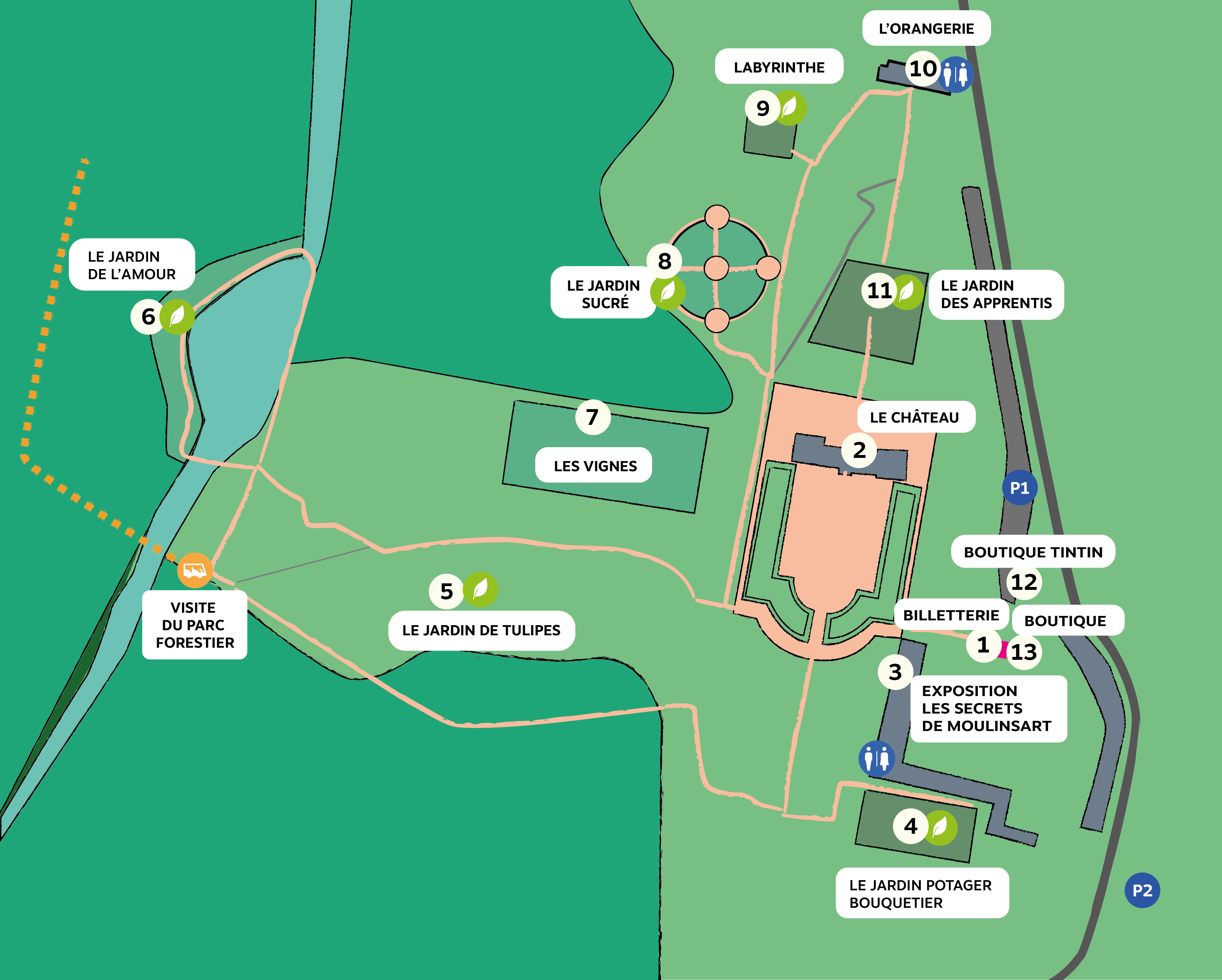 Les toilettes se trouvent après l'exposition Les Secrets de moulinsart (numéro 3 sur le plan), à l'angle du jardin potager bouquetier (4).