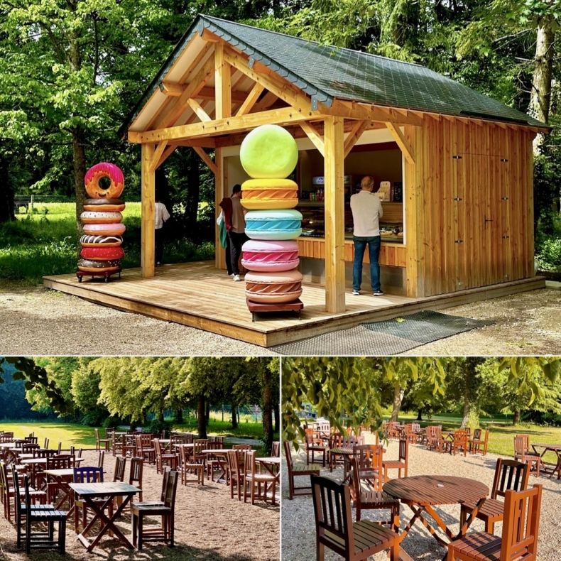 A côté de la sortie du labyrinthe et à proximité de l'Orangerie, un nouveau kiosque propose de la vente à emporter : formules avec sandwich, boissons fraiches, glaces... Juste devant, un espace ombragé avec des tables et des chaises vous permet de déjeuner rapidement, avant de reprendre la visite.