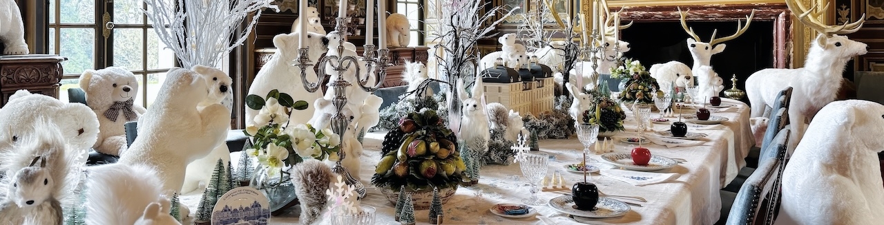 de bois peints racontant l’histoire de Don Quichotte. Au centre, la grande table est somptueusement dressée. Pour l’occasion, elle se pare de décorations hivernales, où ours blancs, rennes et écureuils se rassemblent entre des sapins enneigés pour savourer des pommes d’amour. Prenez le temps d’observer chaque détail.